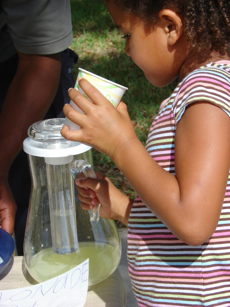 just around the corner she was set up with her brother,the accountant and her father,the supervisor. we sipped our lemonade as she ran off to make the deposit into her big brothers paper cup!